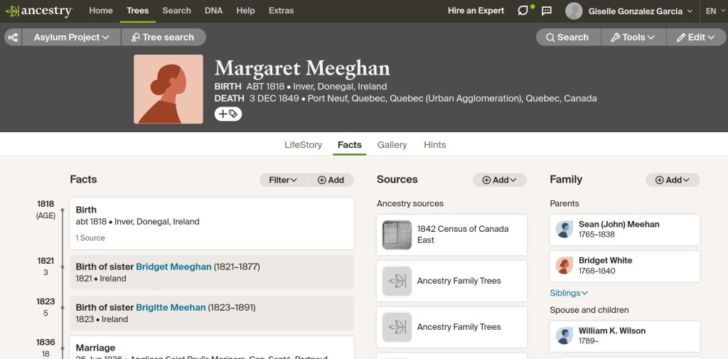 Take, for instance, the case of Margaret Meeghan. When I first searched for “Margaret Meeghan”, I obtained 666,559 results on Ancestry, a number that made finding the woman who was a Beauport Asylum patient something of an impossibility. After filtering those results to North America/Canada/Québec, 4,624 women still remained. On the Beauport files very little to almost nothing was stated about her, but key information was mentioned that could be used to find her on Ancestry’s databases: