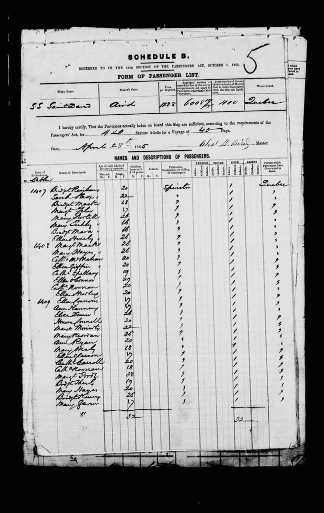 On May 12, 1865, 70 “females” from the Limerick Union arrived at Montreal, having sailed over on the St. David. No list of names, no documentation was provided by the Union. The emigrants in question reported being told “that they were to receive £1 each on landing.” Chief emigration agent A.C. Buchanan wanted to investigate this a little, so he sent the women to the St. Patrick’s Home in Montreal in the meantime. When they arrived, “the Nuns in charge of the ‘Home’ were shocked at the gross impropriety of their conduct.” It appears that this refers to the fact that they “disgraceful[ly] they sold their Boxes, Bonnets, Combs and any article of clothing they could dispense with to procure drink and because not only [were they] shamefully intoxicated but [they] were [also] guilty of the most depraved acts of immorality.” The “allocated” monies arrived on the 15th. After docking what was owed for their stay, the women were given “nearly half a sovereign” … each [for their] Journey into the interior.”