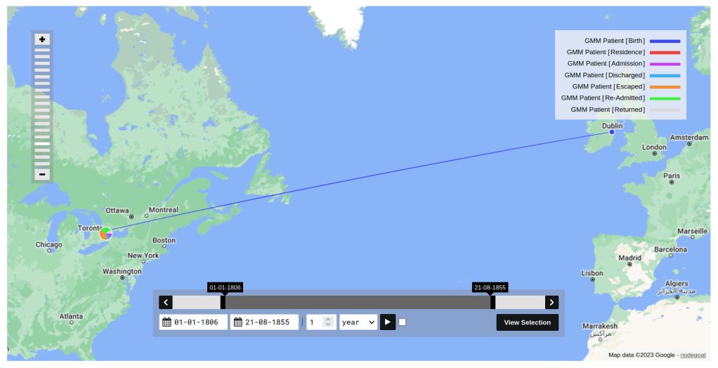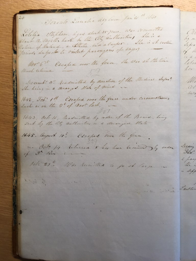 Letitia was born in Ireland, likely in or around 1806, and was thirty-five years old when first committed in Toronto.  She was listed as being married, Catholic, and a pauper.  She was illiterate and unemployed.  There are few details about her specific medical diagnosis, but the case notes state that she was “at certain periods subject to violent paroxysms of anger.”