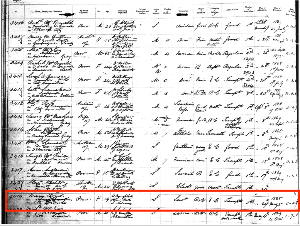 Mary died over 155 years ago. Her story, with all of its various twists and turns, is now the main focus of my research as the GMM Project – focusing on the treatment of the Irish in Canadian lunatic asylums – and the MTC Project – focusing on the experiences of migrating pregnant women and mothers in the colonial medical system – begin to intertwine.