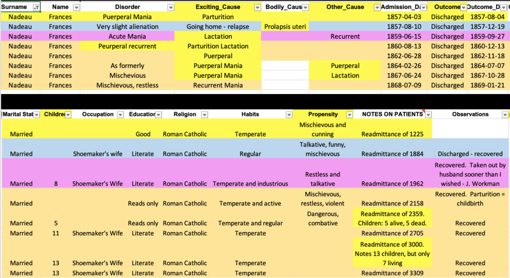 For the Nadeau family, the Provincial Lunatic Asylum in Toronto provided much needed maternal health care and medical support in the initial months after each of Frances’ later pregnancies. What isn’t listed, however, is to what extent the deaths of six of her children affected the recurrence of her postpartum mania with each subsequent pregnancy. Grief can appear in the medical records as part of a diagnosis, but it was not a standard procedure to note down patients’ emotions. We only get glimpses of the inner turmoil a mother like Frances must have suffered.